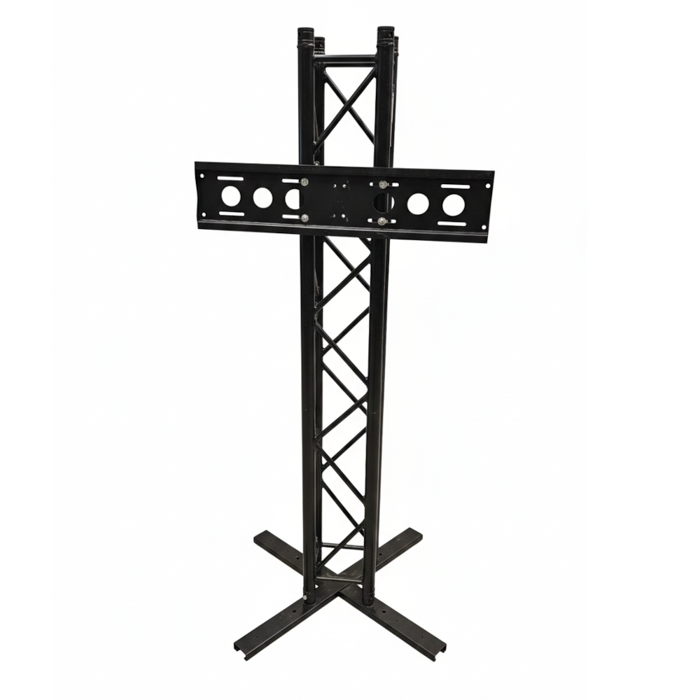 Das Stativ besteht aus einer kreuzförmigen Bodenplatte und einem 2m F34 Truss, beides in schwarz.